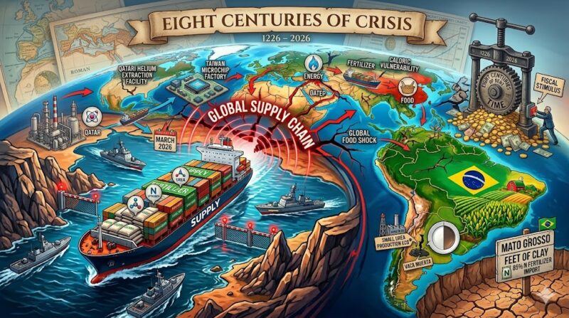 In their seminal analysis of eight centuries of financial history, Reinhart and Rogoff (2009) trace the recurrence of debt crises across 66 countries, refuting the persistent fallacy that “this time is different.” The relevance of that framework is on evident today amid the blockade of the Strait of Hormuz — an event that has revealed a form of logistical blindness to underlying dependencies: from the Qatari helium critical for Taiwan’s microchips, to the Gulf urea that underpins productivity in Mato Grosso. This crisis demonstrates that even the world’s great breadbaskets — which do not produce their own fertilizers and import up to 85% of them — confirm that financial folly translates, inevitably, into a global caloric vulnerability.